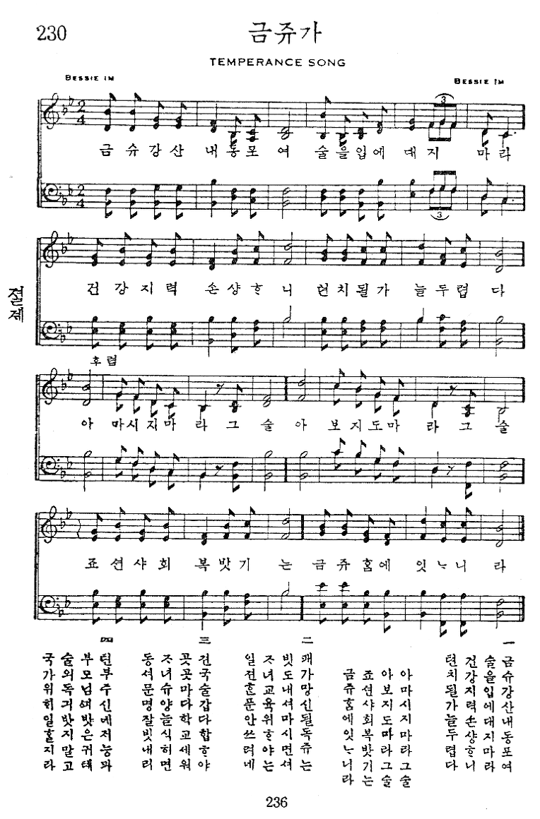 삼천리 반도 금수강산 하나님 주신 동산, 삼천리 반도 금수강산 하나님 주신 동산/ 이 동산에 할 일 많아 사방에 일군을 부르네 / 곧 금일에 일 가려고 누구가 대답을 할까 / 일하러 가세 일하러 가 삼천리 강산 위해 / 하나님 명령 받았으니 반도 강산에 일하러 가세.