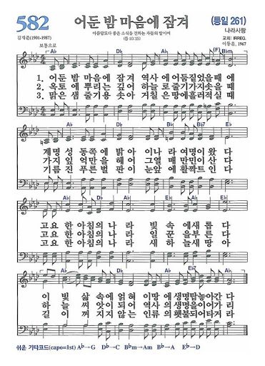 이 찬송은 아래 이미지에서 보듯이, 김재준 작사(1965), 이동훈 작곡(1967년)으로 현용 찬송가에는 ‘나라 사랑’이라는 주제 항에 들어가 있으며, 주제 아래에는 '교회'가 표시되어 있다. 가사 첫 구절을 가져온 찬송 제목 아래에는 "아름답도다 좋은 소식을 전하는 자들의 발이여"(롬 10:15)를 표기하여 복음 선교와 연결시키고 있다. 즉 텍스트 자체만 보면 한국인 작사 작곡의 순수 한국 교회 찬송이요, 고난의 나라와 교회를 복음과 선교를 통해 '새 하늘과 새 땅'의 하나님 나라로 만들어가자는 희망에 찬 찬송임을 알 수 있다. 다만 하나님, 주, 예수, 성령, 교회 등의 직접적인 기독교 용어가 등장하지 않고 비유적 단어만 사용하고 있는데, 이는 이 노래가 불리는 1차적 삶의 정황이 교회와 기독교인의 모임이었지만, 동시에 60-70년대 민주화 운동 집회에서 비기독교인도 함께 부를 수 있는 노래로 만들어졌기 때문이다. 인용한 찬송가 아래에는 기타 코드를 표시함으로써 그런 공개 대중 집회나 혼자서 누구나 쉽게 부를 수 있도록 했다. 찬송가에는 주일 예배 시간에 사용하는 찬송만 수록하는 것이 아니다. 기독교인들이나 비기독교인들이 다양한 장소와 집회에서 함께 부를 수 있는 찬송도 필요하다. 이 582장이 만들어진 역사적 상황과 그 의미, 신학--토착화신학, 세속화신학, 정치 신학--을 살펴봄으로써, 최덕성의 견해를 비판하고자 한다.