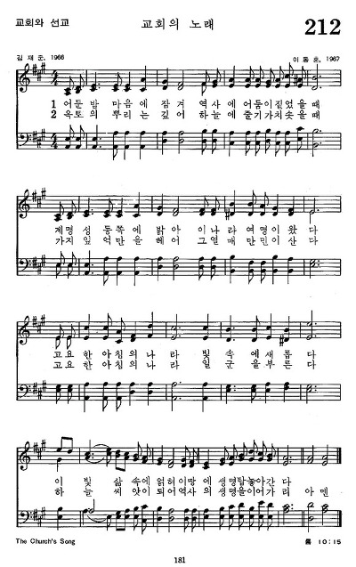 1967년 이동훈의 곡이 붙어 다음과 같이 『개편 찬송가』(1967)에 212장으로 들어갔다. 『개편찬송가』는 장로회(예장 통합, 기장), 감리회, 성결교회의 대표들이 ‘한국찬송가위원회’를 결성하고 만든 연합 찬송가였다. 그 때 한국교회의 신앙고백이 들어가 찬송을 수록한다는 원칙에 따라 새로 만들어진 이 찬송가를 넣었는데, 제목은 가사 첫 줄을 딴 것이 아닌 “교회의 노래”였다. 주제도 "교회와 선교"였고, 찬송 아래 표시한 관련 성경구절도 롬 10장 5절이라 교회와 선교의 노래임을 밝혔다.